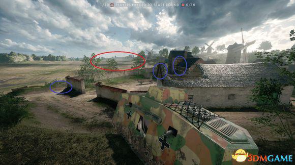 你把坦克开在这个位置,能够让重生在B点的玩家没办法进入旗点防守,而重生在你坦克上的队友又能透过坦克左后方的小道进入B点,另外在这个位置上撤退也是非常容易的,只需要倒车并往左就行了。