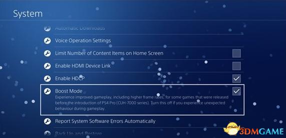 选项下面的小字描述道:允许玩家获得更佳的游戏体验,包括高帧数,支持CUH-7000系列PS4 Pro,如果在游戏过程中发生问题,请关闭该选项。