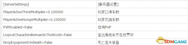 DayTimeSpeedScale=0.200000日时速度NightTimeSpeedScale=3.300000夜间速度DawnDuskSpeedScale=0.300000黎明速度StaminaCostMultiplier=0.100000耐力系数HarvestAmountMultiplier=100.000000收获量系数(100倍 一下一组)NPCMindReadingMode=0N P C读心模式MaxNudity=2裸体等级ServerCommunity=0服务器社区ChatHasGlobal=False全局聊天ChatLocalRadius=0.000000聊天局部半径ChatMaxMessageLength=0最大消息长度EnableSandStorm=False启用沙风暴ConfigVersion=7配置版本?BlueprintConfigVersion=15蓝图配置版本?PlayerKnockbackMultiplier=1.000000玩家击退系数NPCKnockbackMultiplier=1.000000N P C击退系数StructureDamageMultiplier=1.000000建筑伤害系数StructureDamageTakenMultiplier=1.000000建筑受伤系数(游戏里面是物品损坏比例)StructureHealthMultiplier=1.000000建筑健康系数NPCRespawnMultiplier=1.000000N P C重生的系数NPCHealthMultiplier=2.000000N P C 健康系数(建议改成1.5-2倍 抓奴隶更容易)CraftingCostMultiplier=1.000000制作成本系数PlayerDamageMultiplier=1.000000玩家伤害系数PlayerDamageTakenMultiplier=1.000000玩家受伤系数MinionDamageMultiplier=1.000000宠物伤害MinionDamageTakenMultiplier=1.000000爪牙伤害系数NPCDamageMultiplier=1.000000N P C伤害系数NPCDamageTakenMultiplier=1.000000N P C受伤系数PlayerEncumbranceMultiplier=10000.000000玩家负重系数(10000倍 背起一座山)PlayerEncumbrancePenaltyMultiplier=1.000000玩家负重惩罚系数PlayerMovementSpeedScale=1.000000玩家移动速度系数PlayerStaminaCostSprintMultiplier=1.000000玩家耐力成本冲刺系数PlayerSprintSpeedScale=1.000000玩家冲刺速度表。PlayerStaminaCostMultiplier=1.000000玩家耐力成本系数PlayerHealthRegenSpeedScale=1.000000玩家的健康回复速度规模。PlayerStaminaRegenSpeedScale=1.000000运动员的耐力回复速度规模。PlayerXPRateMultiplier=10.000000玩家xp比例系数PlayerXPKillMultiplier=10.000000玩家xp杀死系数PlayerXPHarvestMultiplier=10.000000玩家xp收获系数PlayerXPCraftMultiplier=10.000000玩家xp工艺系数PlayerXPTimeMultiplier=10.000000玩家xp时间系数DogsOfTheDesertSpawnWithDogs=False沙漠之犬与产卵CrossDesertOnce=True穿越沙漠WeaponEffectBoundsShorteningFraction=0.200000武器攻击距离系数EnforceRotationRateWhenRoaming_2=True当roaming_真正执行旋转速率?EnforceRotationRateInCombat_2=True强制轮换率combat_?ClipVelocityOnNavmeshBoundary=True剪辑速度在导航网格边界UnarmedNPCStepBackDistance=400.000000徒手击退距离PathFollowingAvoidanceMode=1路径跟踪避免模式RotateToTargetSendsAngularVelocity=False旋转到目标发送角速度TargetPredictionMaxSeconds=1.000000目标预测最大秒数。TargetPredictionAllowSecondsForAttack=0.400000目标预测允许秒攻击。MaxAggroRange=9000.000000最大的仇恨范围serverRegion=0服务器区PVPBlitzServer=FalseP V P 闪电战LandClaimRadiusMultiplier=1.000000土地半径系数ItemConvertionMultiplier=1000.000000物品制作速度系数PathFollowingSendsAngularVelocity=False下坡加速度UnconsciousTimeSeconds=900.000000眩晕时间(秒)不知道晕到死的奴隶还能不能醒ConciousnessDamageMultiplier=1.000000眩晕伤害倍数ValidatePhysNavWalkWithRaycast=True与在物理导航步行验证?LocalNavMeshVisualizationFrequency=-1.000000局部导航网格可视化频率UseLocalQuadraticAngularVelocityPrediction=False利用局部二次角速度预测LQAVPUseTime=0.150000使用时间LQAVPFadeTime=0.100000褪色时间LQAVPMethod=2L - P法NetworkSimulatedSmoothRotationTimeWithLQAVP=0.100000网络模拟平滑旋转时间与L Q V PAvatarsDisabled=False禁用化身AvatarLifetime=60.000000阿凡达的一生(秒)(应该是化身的持续时间)AvatarSummonTime=20.000000阿凡达召唤时间 (应该是吟唱时间)IsBattlEyeEnabled=False战士的眼睛(战神之眼?)RegionAllowAfrica=True区域允许非洲真实RegionAllowAsia=True区域让亚洲成真RegionAllowCentralEurope=True区域允许中欧真实RegionAllowEasternEurope=True区域允许东欧真实RegionAllowWesternEurope=True区域允许西欧真实RegionAllowNorthAmerica=True区域允许北美国真实RegionAllowOceania=True区域让大洋洲成真RegionAllowSouthAmerica=True区域允许南美国真实RegionBlockList=区块列表bCanBeDamaged=TrueB可以损坏CanDamagePlayerOwnedStructures=False会损坏玩家自己拥有的建筑ResourceRespawnSpeedMultiplier=3.000000资源重生速度系数