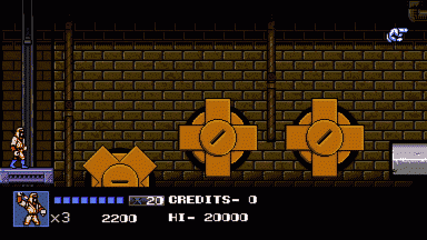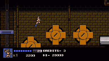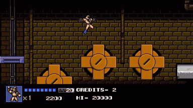 所以有时要灵活运用角色技能,实在跳不过去,可以让影子武士先跳过去,然后弱鸡这边死一命拖屏幕过去。如果镜头没有移动过去,大不了死3命等会儿镜头过去了再续关,反正一共就2关有跳齿轮。2p攻关7个币绝对够用了。