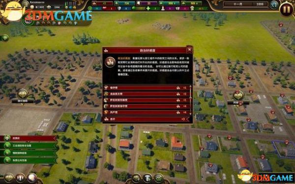 政治好感度:衡量着玩家与城市中其它政党之间的关系,请求一些政党帮忙会消耗他们的好感度。好感度也影响着各政治对议会中各法案的看法和态度。