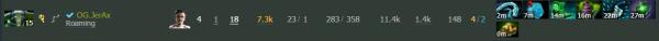 宇宙哥的孽主在装备选择上与国内选手没有太大的区别,都是先做出大鞋,然后看情况转炎阳纹章或笛子。但与国内队伍不同的是,宇宙哥会在很早的时候就点出大招,并且频繁地在游戏的前期单人开大刷钱。有意思的是,如果宇宙哥前期在线上压力很大,他通常会在二级的时候直接钻入野区发育。而在对抗秘密的首局比赛中,孽主与Chen共享同一片野区,并没有出现抢野的情况,EG在资源分配上做的非常到位。