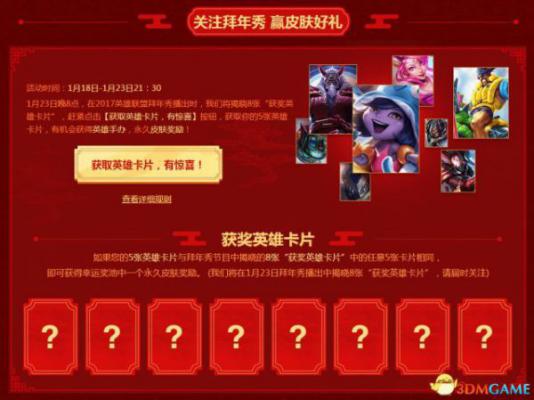 1、1月23日,在2017英雄联盟拜年秀播出时,我们将揭晓8张英雄卡片,如果您的5张英雄卡片与拜年秀节目中揭晓的8张“获奖英雄卡片”中的任意5张卡片相同,即可获得幸运奖池中一个永久皮肤奖励。