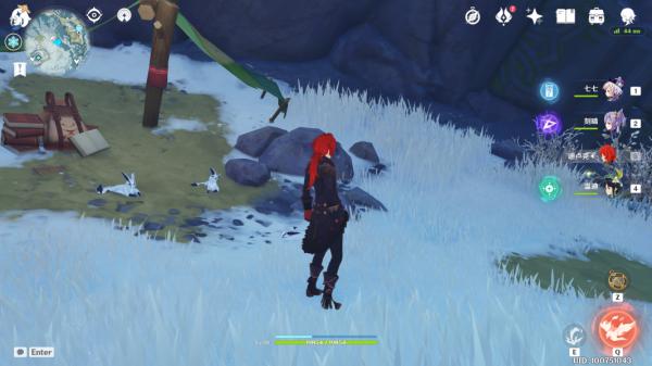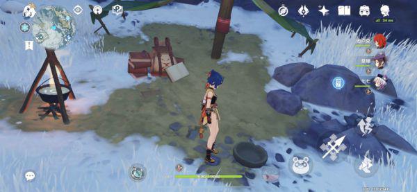 2、营地附近有个盆,就在下图香菱旁边,靠近有喂养两个字,点击即可投喂两颗树莓(一定要完成雪山迷踪任务,不然走到这个盆是不会有反应的);