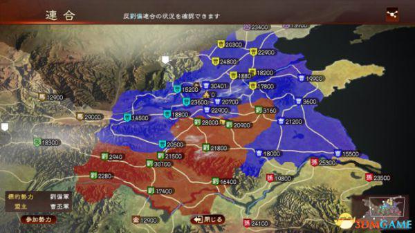 【合纵】成功,反刘备联合组成。青是联合势力、赤为刘备势力。