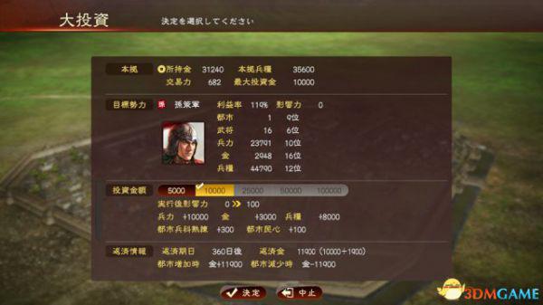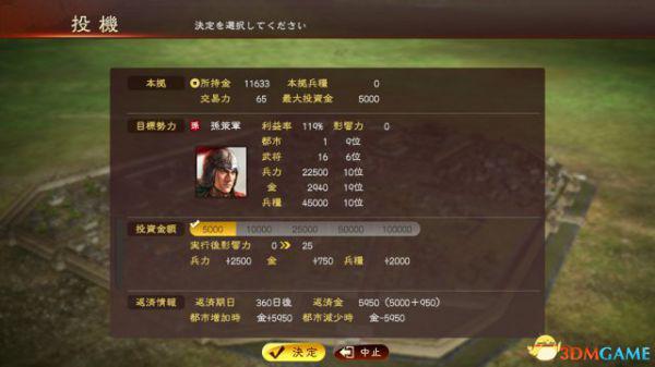 使用【投机】投资了孙策军5000元。对孙策军的影响力增加、孙策军的兵力、金钱、兵粮上升。