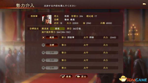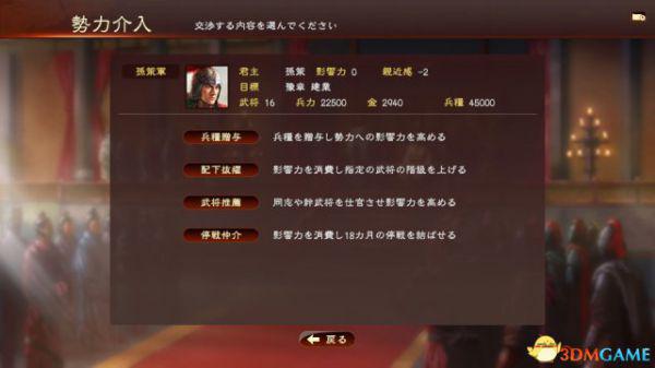 使用【势力介入】能进行交涉之一是“武将推荐”。推荐同志、在野绊武将给介入势力,使其当官。