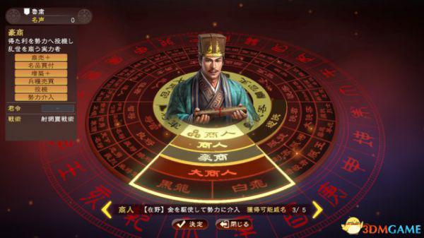 构筑起庞大的私人财产,介入各种势力,使用金钱来操纵天下。可以体验煽动战斗获利、支援弱小势力使其获胜等种种乱世的黑幕。