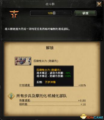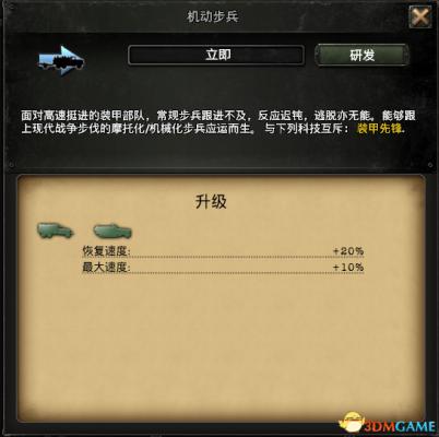 提高速度以加强分割包围的能力。10%看上去说多不多说少不少,但是走这样学说的部队一般都是指望用装甲部队来分割包围,无论是单机还是联机,一般来说该包围都能包围住,包围不住的加点速度也没啥用。真正就差这10%速度的场景应该不多。战斗力提升……+1%