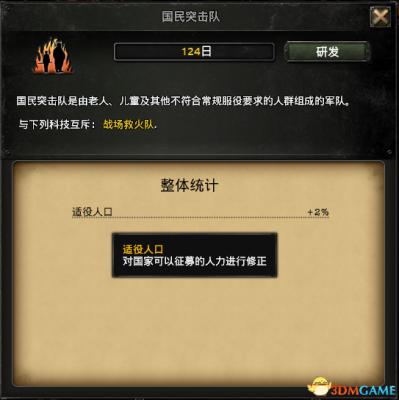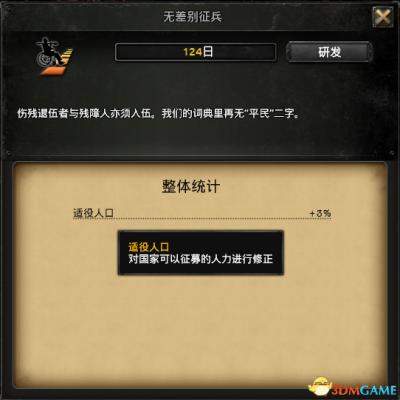 这个学说和上个学说放在一起说,总效果是增加5%人力。在我看来,这并没有什么意义,因为四代可以轻松通过切法案的方式获得大量人力。想要这两个学说的人,一般都是点了广泛征兵+总动员,因此只有2%的人力,然后又不想点10+的按需服兵役拿7%人力的同时吃debuff。然而按需服兵役的debuff事实上相当小。该兵役效果如下: