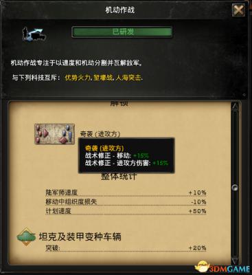 机动作战学说往往适合想要出大量装甲的国家,强调对装甲部队的加成和部队速度的提升。