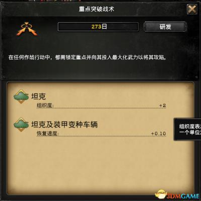 坦克部队本身的组织度为10,+1的效果看上去增加了10%的组织度,然而问题是装甲部队的组织度本来就不由坦克提供。该效果给装甲部队的实际组织度提升仅约为0.5点,约1.5%的提升。当然,对非装甲部队该效果一点用都没有。