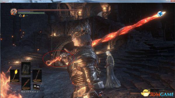 我们可以从她手上的伤口发现,烧伤最严重的部位为向上条纹状,看不清的小伙伴可以进游戏仔细观察一下。而普通的火焰是不会形成这样的规整的伤口的,只有一个规整的物品并且带有火焰才会形成这样的伤口。而防火女一般是不会离开祭祀场的,所以我们可以从祭祀场来找出这个东西,那么条纹状并且带有火焰的东西是什么呢?
