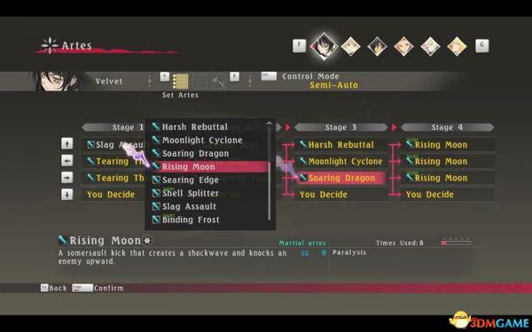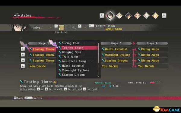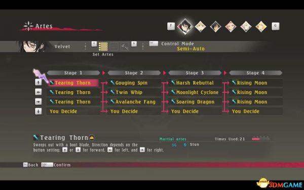 技能对应↑↓←→四个键位,每个键位可以指定1到4阶(stage)四个技能。