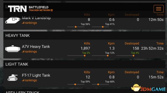 本人是PS4主机狗,主打美服,现在kills、destories top rank在前3%-4%左右,重坦平均场次K/D率不低于10,一般出现得最多情况不管输赢通常是K 40-50个,D 2-3次左右。