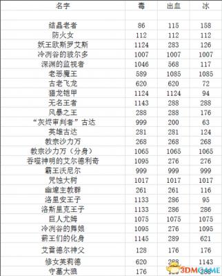 最后是1周目情况下所有BOSS(顺便带上防火女)的抵抗值。目前的资料一般都说BOSS抗XX/弱XX,但是实际看到抵抗值更直观一些。这些数字大多是算出来的,其中一部分在游戏中进行了验证,应该没有问题。不过有一些四舍五入的小误差也是可能的。