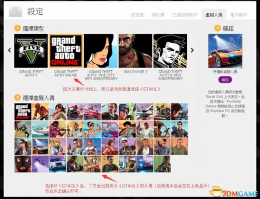 之后则进入到选择类型以及人偶界面——其实就是选择头像库和选择游戏头像,不同的游戏有不同的头像库,因为是针对GTAOL的注册,所以在库的选择上选择了GTAOL(库的选择只影响到头像的分属类别,不会影响游戏)。