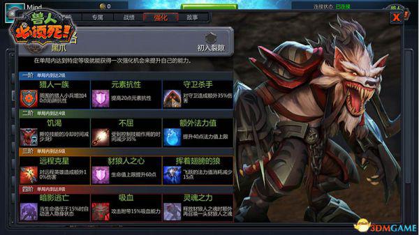 刺杀神技 防守英雄的梦魇黑爪的左键利爪对多名敌人进行横扫攻击了,伤害随等级提升而提升,技能动作相当炫酷让人爱不释手。右键技能“万年杀”用利爪捅伤敌人并使其流血,被命中的敌人全身通红,很有嗜血的感觉。Q技能“豺狼人之魂”,召唤出的豺狼人有400点生命值15点攻击能够存在15秒钟,是切守卫干扰防守的神技。E键技能:“撕咬”用嘴撕咬敌方造成大量伤害并且可以回复自身血量,命中目标后则可以看到黑爪身上有绿色光环为自己回复生命。被动技能:二阶跳,连击两下空格向前飞跃,冷却时间只有0.5秒逃生的神技。