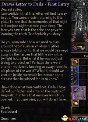 阅读这件物品后发现,文中提到的一个名词,是苦痛阶梯的最后一层,于是前往,在最后一层的隐藏区域,发现一缕蓝烟,我就知道我来对了地方,屏幕上一行黄字略过,背包里多了dravis留言的第二部分。