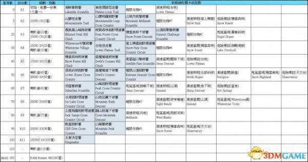阶段星等奖励、各回合新解锁的赛事路线、特技挑战点、极限任务等,就直接表列了