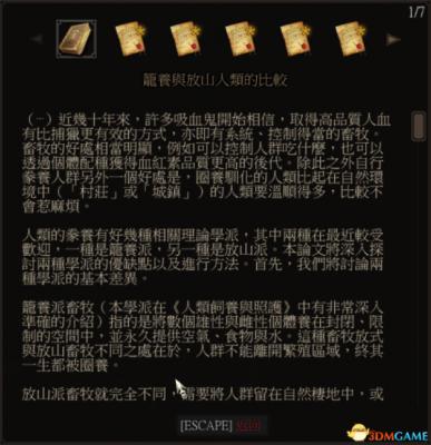 有个任务让杰洛特去已经衰败的吸血鬼堡垒迪沙谬那遗迹找炼制魔药的材料,在去的时候雷吉斯给杰洛特提到过以前的吸血鬼将人类当成提供食物的家畜,所以在迪沙谬那可以看到很多关“家畜”的畜笼,在两边的石架上可以找到一篇吸血鬼讨论如何养殖人类的论文,就像人类研究如何养殖家畜的论文一样,看上去似乎没有什么不对哦。