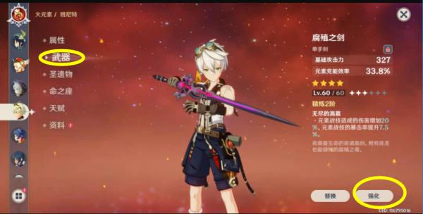 4、打开佩戴腐殖之剑的角色,点击武器,点击强化;