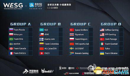 欧洲区冠军队伍Team Dignitas因赛事赛程与战队自身原因弃权本次比赛,考虑到时间与签证因素,其名额将由原欧洲赛区9-12名战队epsilon顶替;同时原欧洲赛区CS:GO项目亚军Team Russia递补为欧洲赛区冠军,与其他三个洲际赛区冠军一同作为种子队伍落入四个小组,具体分组名单如上图所示。