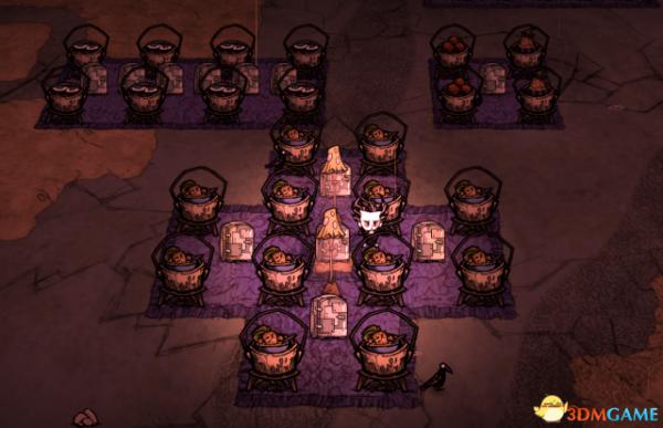 开建筑网格一个角边缘摆放锅,之后最近的可造距离再多挪动一个格子造第二个,四个刚好摆满一个地皮,中间放冰箱,这样一个冰箱同时照顾4口锅,打开冰箱同时打开锅,SHIFT冰箱里面的东西就能做饭,连续做饭不用反复关冰箱门。(基本多玩玩都会选择这么造)28,熟悉操作虐杀小动物,游牧也能活