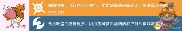 虽然日月的图鉴里没写,但是烈雀的设定中是这么写的:烈雀会吃像绿毛虫和独角虫这样的虫精灵,烈雀也可能吃掉别的神奇宝贝的蛋。此外,由于在日月中烈雀的栖息地2号道路与3号道路中只有萌虻这一种昆虫类型的精灵,所以也不排除吃萌虻的可能性。