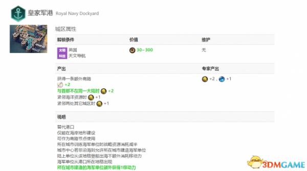 英国本身关联海岸,经常意味着没有淡水。但相比西班牙,我觉得英国的皇家海港是很不错的补偿。如果能把港口修在海上资源的附近,然后和岸上的商业中心相邻(布局合理的话,商业中心甚至能和两个皇家海港相邻的同时再沿河),会带来非常可观的金币收益。在我看来,英国和西班牙都是经济非常发达,可以是金币来转换产能,不需要依赖工业区的文明。