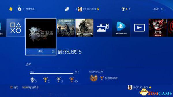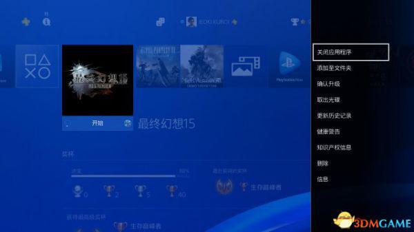 7)选择FF15的图标,按手柄上的“OPTION”键,选择关闭应用程序,并按“OK”确定(如下图):
