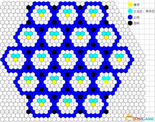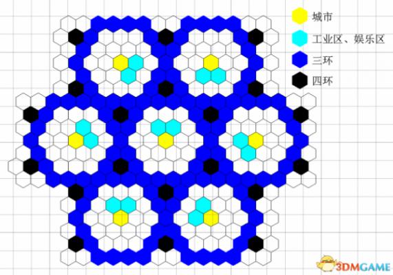 工业区和娱乐区有6格的加成,要最大限度的利用,而且给城市间留足够多的空间地格只有这样布局,我试过一个工业区和娱乐区管7城,但是那样整个布局太乱而且城市地格太少,这样一个管三,而且给每个城留有发展成超大城的足够空间,要知道这代区域很多,加上山脉,地格有点不够用。