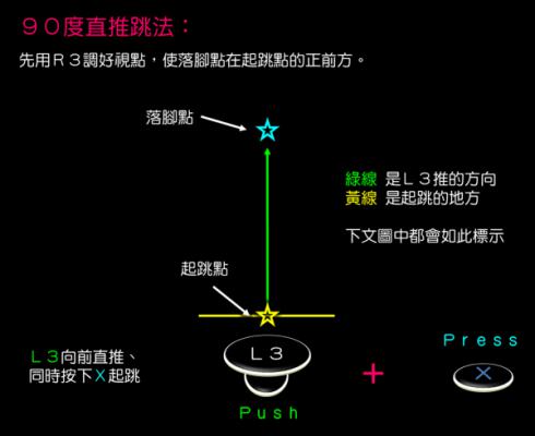以下先说明90度直推跳法是什么,有一些攻略看见王子可以潇洒地任意跳跳跳而不失误,然而对于我来说这实在是幻想啊!还是花一点时间用R3调好角度,这样会易跳一点。