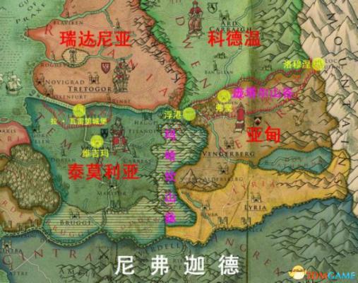 可以看到,这一代的剧情集中在整个北方部分的西北边,也就是第一张图的瑞达尼亚和泰莫利亚之间,至于玛哈坎山脉以东,则只有在游戏中提到战争形势的时候提起过。后面我们也会提到。