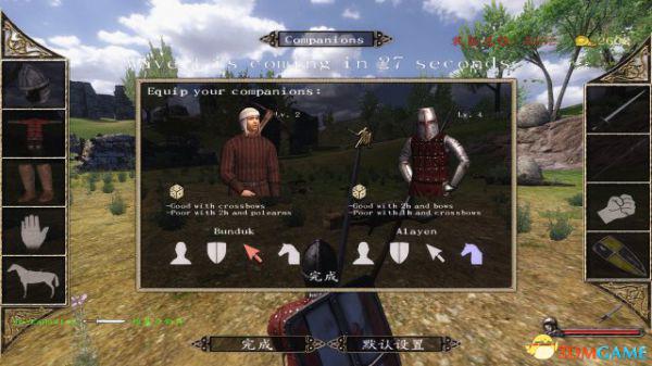 然后你就进来了,地图上你可以带两个NPC,下面那四个图像从左到右依次是本体(?)、步兵、弓弩手、骑兵,也就是说你可以选择NPC的职业,旁边的骰子是随即选择。NPC下面那两行英文意思是说NPC擅长(Good)和不擅长(Poor)什么,比如说班达克擅长用弩,艾雷恩则不擅长用弩。NPC脑袋旁边的LV是NPC的等级,似乎是根据杀敌来升级的,级别越高身上的装备越好。