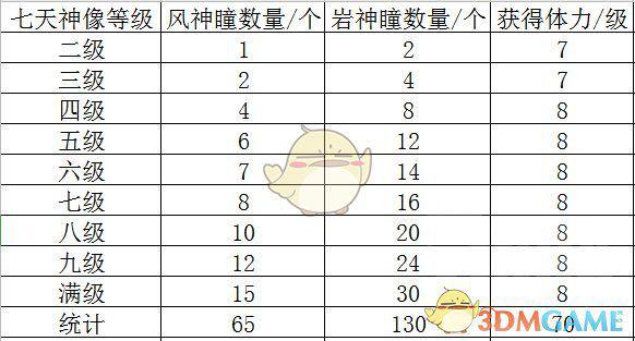 风神瞳一共66个,各级七天神像所对应的神瞳数可见下图
