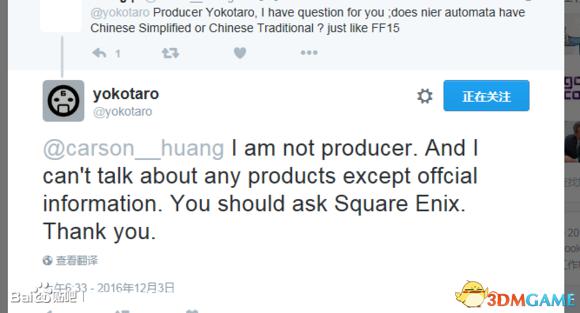 尼尔机械纪元有中文版吗?相信这是很多玩家关心的问题,近日一位中国玩家在Twitter上询问了Yokotaro