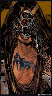 游戏中的力量牌,女人和狮子以纹身的形象出现在一个女人的胸前,纹身呈蓝色,象征睿智与冷静。牌面整体部分为代表烦躁的黄色,人物带着兜帽,象征隐藏与压抑。本应象征内心力量的团印在了内心上,可以认为这位女人将内心力量作为自己的座右铭,但我们要注意到这个女人有着有着漩涡帮风格的高度改造的面部义体。不知道大家有没有发现,力量牌中这个女人的内搭和魔术师牌中的女人很像,只不过魔术师外搭一件高领夹克,力量牌外搭一件兜帽斗篷。同时仔细看魔术师的胸口有一些或白色或黄色的痕迹,是不是可以说明,魔术师牌和力量牌中是同一个人,只是魔术师除掉了纹身换了件外搭而已?