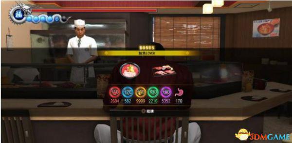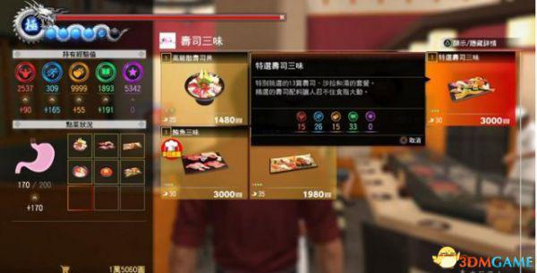 第三次菜单全点就会超出满腹度了,这里我们第一排最后一个30满腹度的特选寿司三味不点,吃完后满腹度180,减100的药和50的各用一个,满腹度变为30;