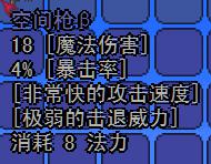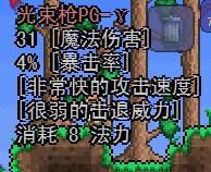 当你掌握到打肉山的方法时。你就会发现这个萌萌的家伙其实就是个宝物盒, 无论是对近战党还是远程党或是魔法党。对于咱们来说,好东西就是光束枪和法术徽章了。法术徽章后面再讲。我们先来讲讲光束枪,输出方式就跟普通的枪一样,当你朝某个方向按下左键的时候,你会听到嗖的一声,一道光束飞了出来。之后你遍听到某只蠕虫的哀嚎。没错,光束枪有穿透效果,伤害也不错,光有着两点就让他在魔法武器中占了一席之地。对付新手头疼的小白龙与黑长直,这把武器也能出不少力。光束枪和魔晶风暴各有各的优点,个人认为光束枪伤害高一点,并且适合在平地运用。