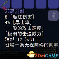 如果不出意外 邪恶荆棘应该是你得到的第一把魔法武器,虽然后期就是塞箱子的货,但是我们不得不承认它强大的效果,至少对于新手来说。多段攻击变相提升了击退。不过伤害真心令人蛋疼,而且消耗12的法力对于刚接触魔法党的新手来说略大。虽然特性可以防止僵尸撸门,但是这个独一无二的特性还不如一块石头来的快捷方便。