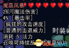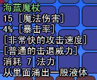 首先是魔晶风暴,有了这个后使用得当肉山后是基本不会死了,魔法消耗量不高,反弹的特性让其使用方法多变,26的魔法伤害基础在高速下也够看了,称之其为法系大鲨鱼真心不为过。在某些地形有奇效【比如说pvp中的小房间,垂直向下挖矿时的矿洞。】其效果与蠕虫撞上尖钉球的效果差不多【蠕虫类各种苦逼啊】。不过多数情况下还是直接射过去来得痛快。另外,魔晶碎片没有穿透效果。顺便一提,射出来的魔晶碎片很像小蝌蚪。