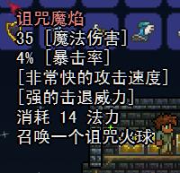接下来是诅咒魔焰,这个武器相对于魔晶风暴来说伤害高了那么一些,但是速度慢了不少,耗魔也多,但在自然的恩赐这种神器的效果下也可以无视了。魔焰的体积比魔晶碎片大,如果速度再快一点,在狭小空间内的效果会优于魔晶风暴。同样可以反弹,值得一提的是射出来的火球有穿透作用,击中后可能会附加诅咒燃烧效果【跳进水里也不会消除】,只可惜火球飞行一段时间后会掉落下来,不太适合与打机械骷髅这类满天飞的boss和怪物。但相比来说,我更喜欢诅咒魔焰。水中使用许可,另外,如果在平地或者不算崎岖的地面上,还是比较推荐使用诅咒魔焰或光束枪的,至少它还有穿透作用。这种地形上的魔晶风暴还不如几发魔晶弹。