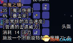 作为四本书之一,恶魔之镰的威力绝对是不可小视的。发射时,镰刀先回在原地旋转几周,再朝某个方向发射,就像水箭魔法书一样,恶魔之镰有着多重伤害,我个人认为这是肉山前最强的魔法武器了。但是由于那坑爹的爆率【地狱的恶魔掉落。】这把武器并不像永夜,迷你鲨一样人人都有。