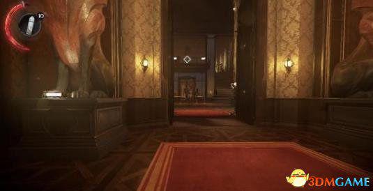 4、此时大堂里有一个发条士兵几乎是无死角地守着,要想办法潜行过掉它,进它身后两个楼梯中间的门。