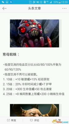育母蜘蛛。蜘蛛这个英雄,容易混线,升级快,打的好的一压二不成问题。一手绝活蜘蛛在比赛里常常能够作为奇兵出现,打的对方鸡犬不宁,辅助不敢露头。新版本的蜘蛛升级更加迅速。25级之后多加的8个蛛网(我没看错吧?)。让蜘蛛能够从牵制一条线到牵制俩条线。放任这样的蜘蛛成长,是一件很可怕的事。[小编绝活蜘蛛告诉你,蜘蛛这版本就是铺盖的,太脆弱了...]