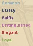 由上往下稀有程度依次增加。最下面浅绿色的“忠诚”品质必须通过各种官方活动获得。