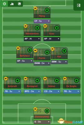 赛季中忘了截图,上图是我的常规首发阵容。使用的是米兰的经典阵型圣诞树。需要说明的是,现实中的大腿巴卡被曼联勾得闹情绪,被我卖了。阵容中其他人多半都是米兰本季的主力了。