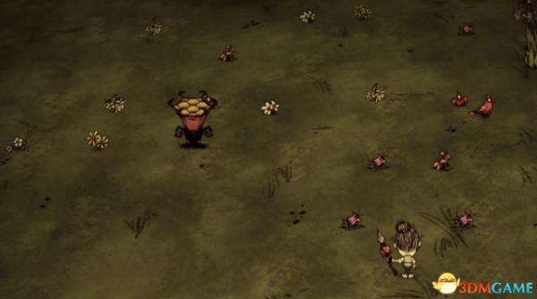 这里边呢,我们要进行一波战场打扫,以便腾出位置,进行一些站前的准备。众所周知,蜂后boss巢穴周边,花很多,还有一些草,树枝,杀人蜂巢,等等之类,能打扫的地方尽量打扫一下。如下图,有杀人蜂,花很多,全部打扫完比较OK,那腾出一些地方就可以,也不用太大,大概半个屏幕就差不多了。