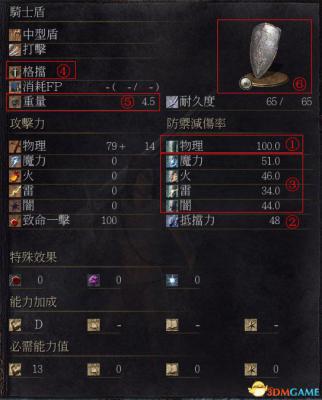 评价一个盾牌格挡好不好,主要分四个方面,从上到下依次是:①物理格挡率;②抵挡力;③属性格挡率(魔法、雷、火和暗四个类型);④战技盾还是弹反盾(中盾限定);⑤负重;⑥帅不帅